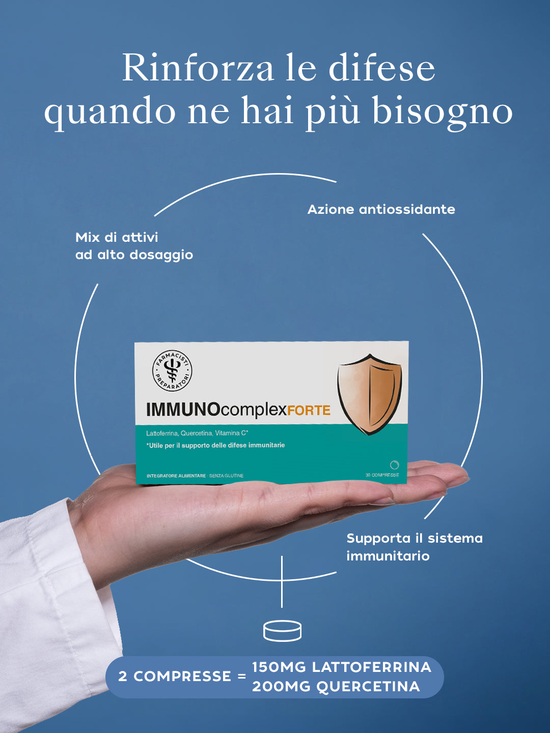 Per questo abbiamo unito efficaci attivi immunomodulanti e antiossidanti in un mix esclusivo composto da Quercetina, Lattoferrina (ben 150mg in due compresse), Vitamina C, Vitamina B3 (Niacina) e Zinco che supporta la normale funzione del sistema immunitario. Quercetina e Vitamina C hanno una potente azione antiossidante.