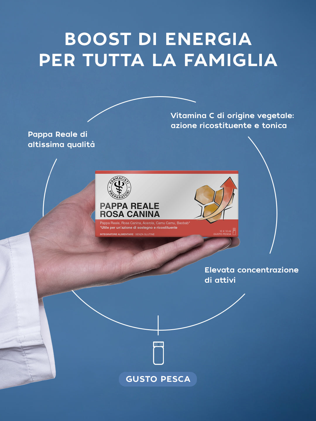 Integratore alimentare a base di un mix sinergico di Pappa Reale ad alta concentrazione di attivi e Vitamina C da 4 fonti di origine vegetale, che svolge un’azione ricostituente e tonica. Adatto a tutta la famiglia, in particolare anziani e bambini.